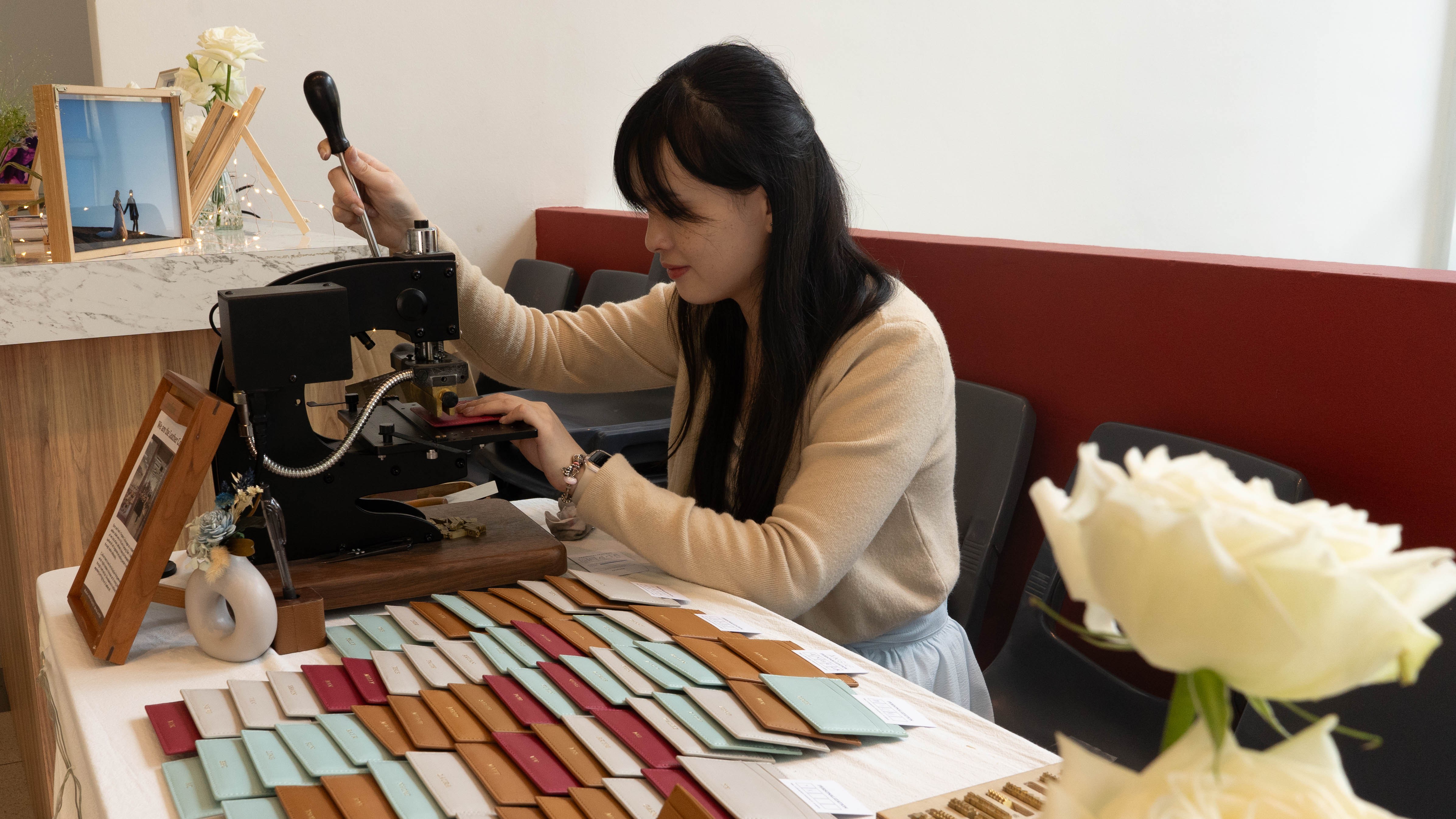We love creating moments where guests can jump in, get creative, and add their own personal touch right on the spot. Delight your guests with our hotstamping booth, where our craftsmen personalise each door gift with initials or names using hot foil stamping. Adding an elegant, thoughtful touch to both the gift and the event.