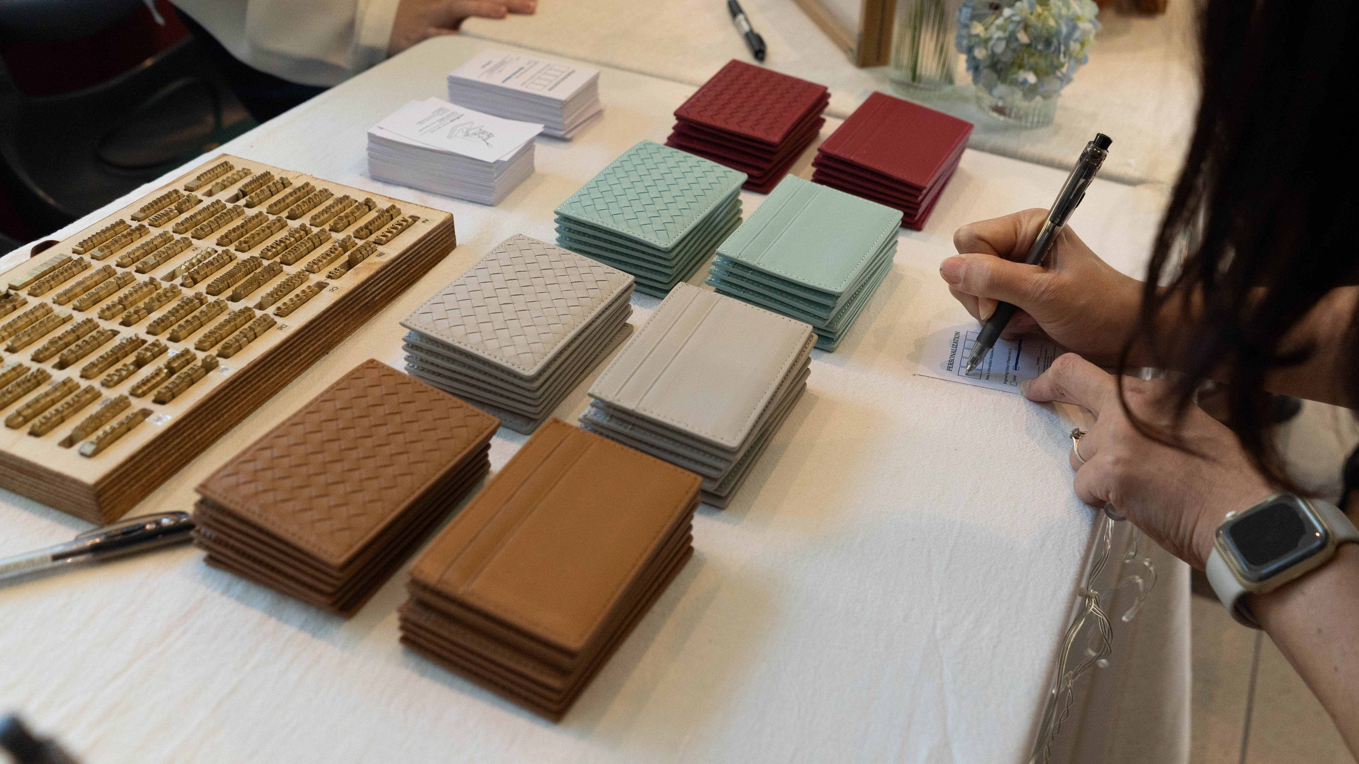 Elevate your wedding reception by mesmerizing your guests with our leather engraving booth, where our Craftsmen will customize each door gift with initials or names using opulent hot foils. Introducing a refined touch to both the gift and the event.